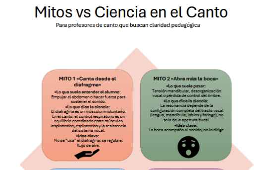 Una guía visual clara y concisa que desmonta algunos de los mitos más comunes sobre la voz cantada, explicándolos desde una base científica accesible. Ideal para profesores de canto que desean fundamentar su intuición pedagógica y ofrecer explicaciones más seguras y conscientes a sus alumnos.